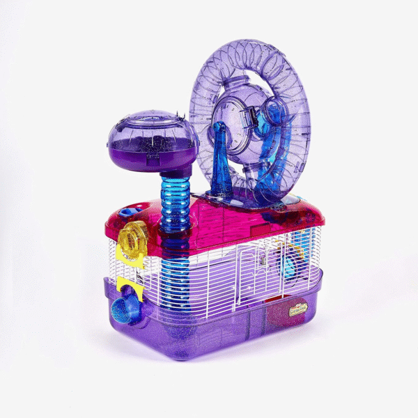 - El Kaytee CritterTrail Dazzle Turn-About es un hábitat completo y visualmente llamativo diseñado para pequeños roedores como hámsters, jerbos y ratones. Su estructura de un nivel incluye una rueda externa giratoria, una torre mirador y una puerta frontal de acceso, lo que facilita tanto el entretenimiento del animal como la interacción con el cuidador.